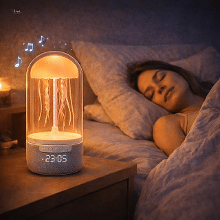 Esta innovadora lámpara con altavoz Bluetooth combina sonido, luz y diseño moderno en un solo dispositivo multifuncional. Con un sistema de movimiento mecánico que simula medusas flotantes, es perfecta para decorar ambientes, crear una atmósfera relajante o sorprender con un regalo original.